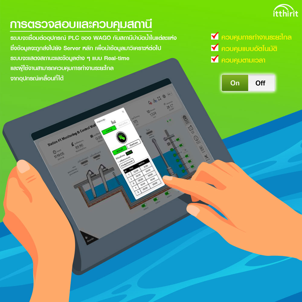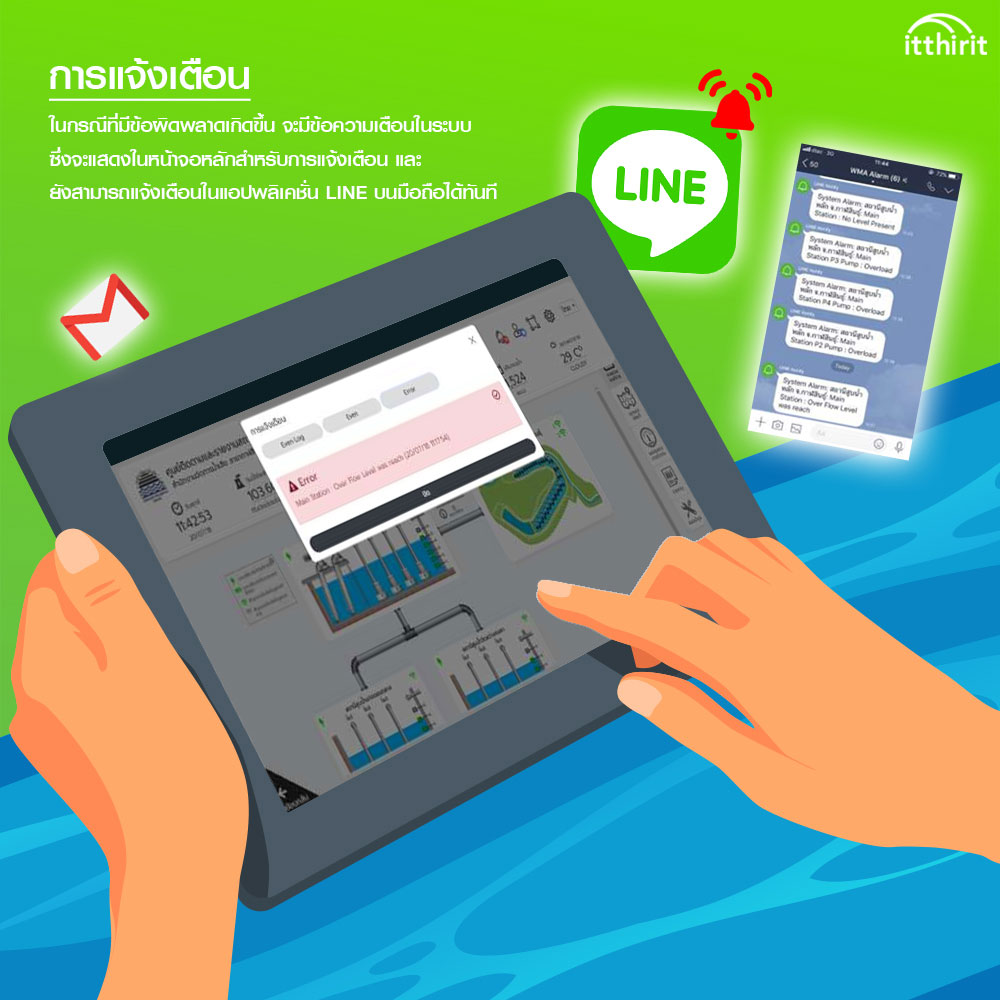 System exampleThe wastewater management system operates by sending all data to a data storage server, which can be either an internal server or a cloud-based server. On the system's interface, it displays the operational status and summarized information, such as the total water flow, pump and motor statuses. It also provides alerts in case of abnormal pump or motor operation. Itthirit Technology Co., Ltd. provides an all-encompassing service for the government's wastewater management. The system monitors water levels, pump statuses, and other environmental conditions, ensuring water quality throughout the station. Data is transmitted via the 3G network to a Cloud Server for analysis and display, allowing real-time tracking and comprehensive reporting. In case of errors, the system will display alert messages on the main screen for notifications. Additionally, immediate notifications can be sent through the LINE application on mobile devices. The system connects WAGO PLC devices to wastewater treatment stations at various locations. The data is then transmitted to the main server for further analysis. The system provides real-time status and various information. Users can remotely control the operations from mobile devices. The data stored in the main server is analyzed to design reports tailored to meet specific requirements, supporting users to enhance their efficiency and productivity.