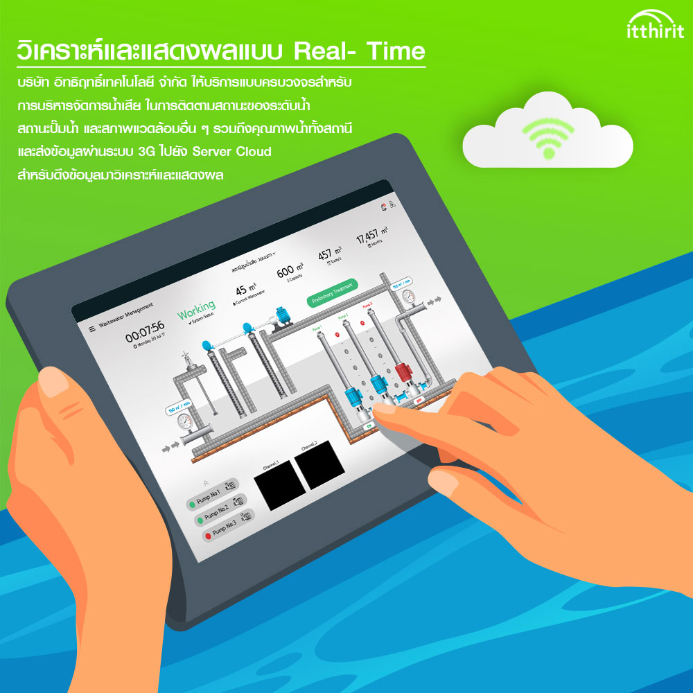 Waste Water Management SystemItthirit Technology Co., Ltd. Providing a comprehensive service for wastewater management, the system allows real-time monitoring of water levels, pump statuses, and other environmental conditions. It ensures water quality across the entire station and sends data via the 3G network to a Cloud Server for analysis and display. The system shows operational statuses and summarized information, such as total water flow, pump and motor statuses. It also issues alerts in case of abnormal pump or motor operation.